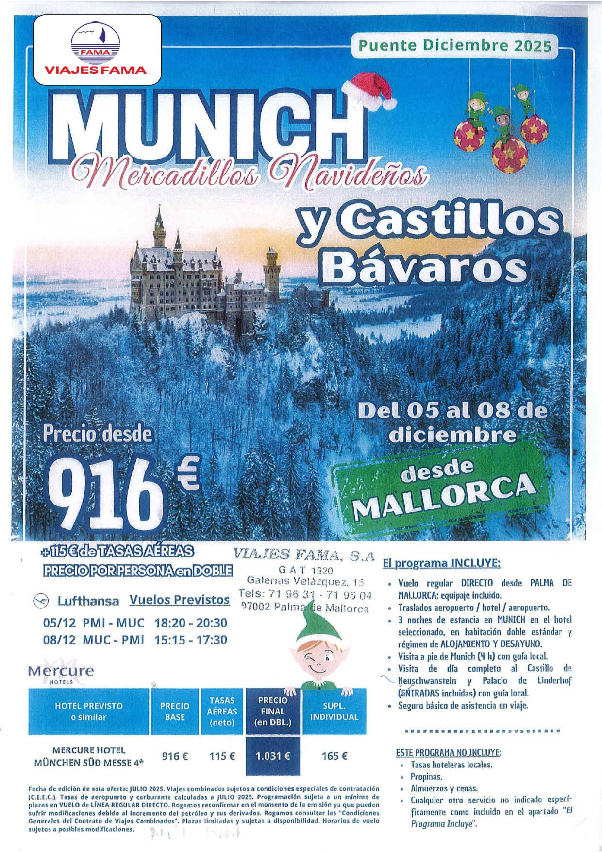 VUELO DIRECTO DESDE PALMA- TRASLADOS- 3 NOCHES DE HOTEL CON ALOJAMIENTO Y DESAYUNO- VISITA A PIE DE MUNICH CON GUIA LOCAL- VISITA DE DIA COMPLETO AL NEUSCHWANTEIN Y PALACIO DE LINDERHOF (ENTRADAS INCLUIDAS)